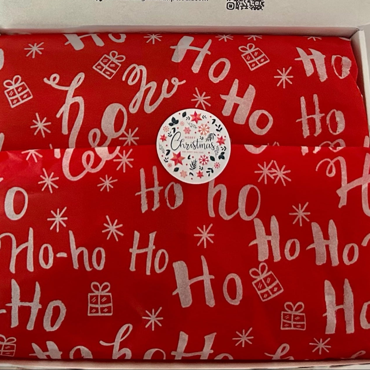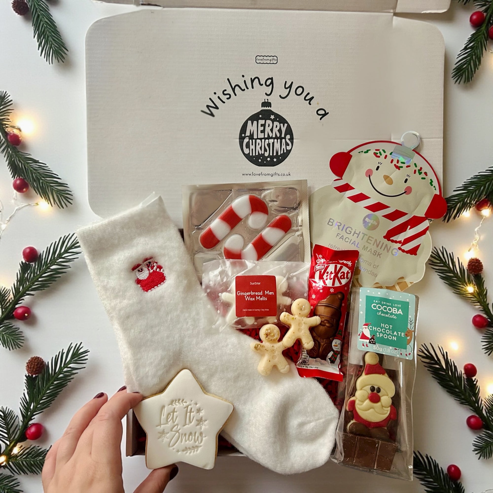 Christmas gift box with pink socks, cookies, and snacks on a white background with festive lights.