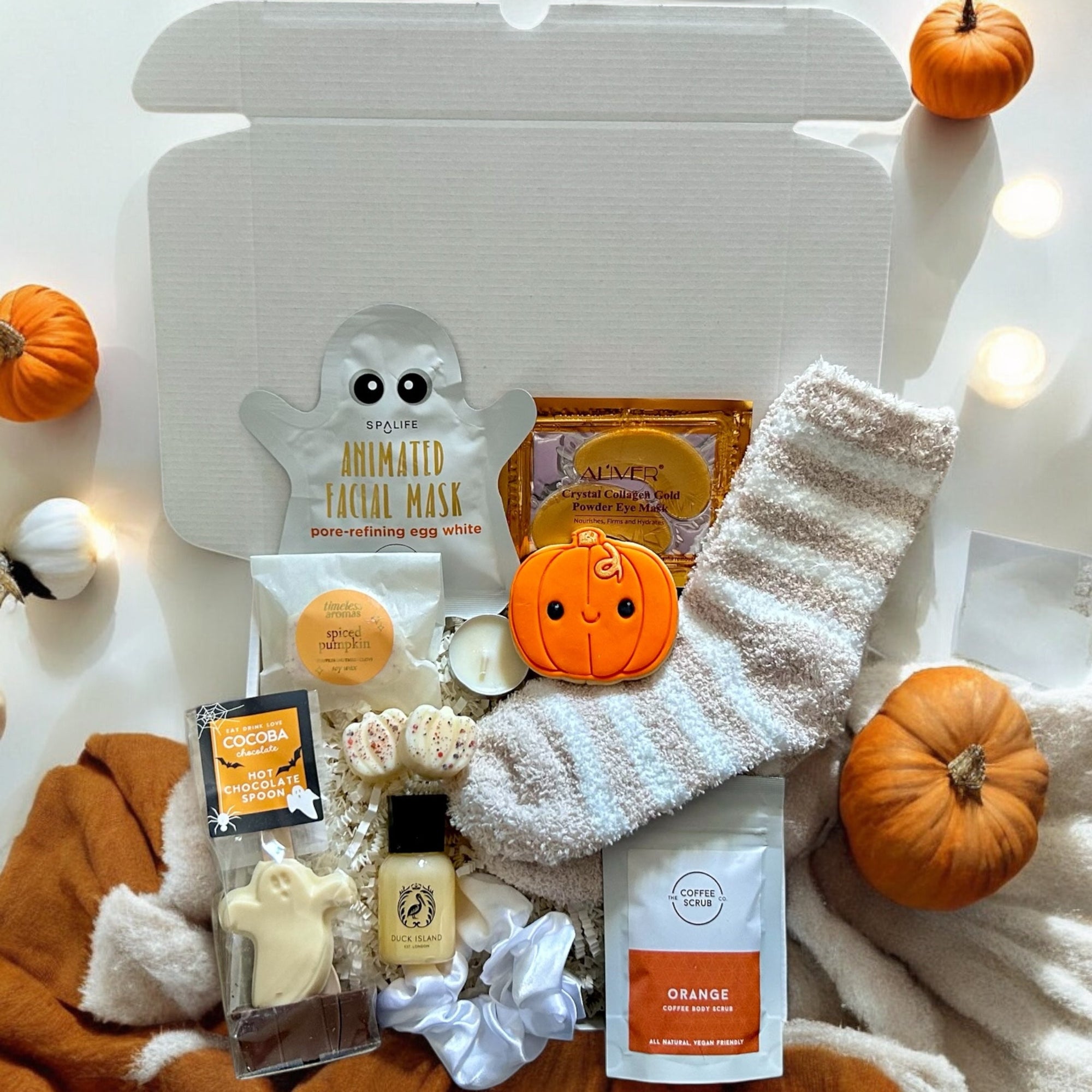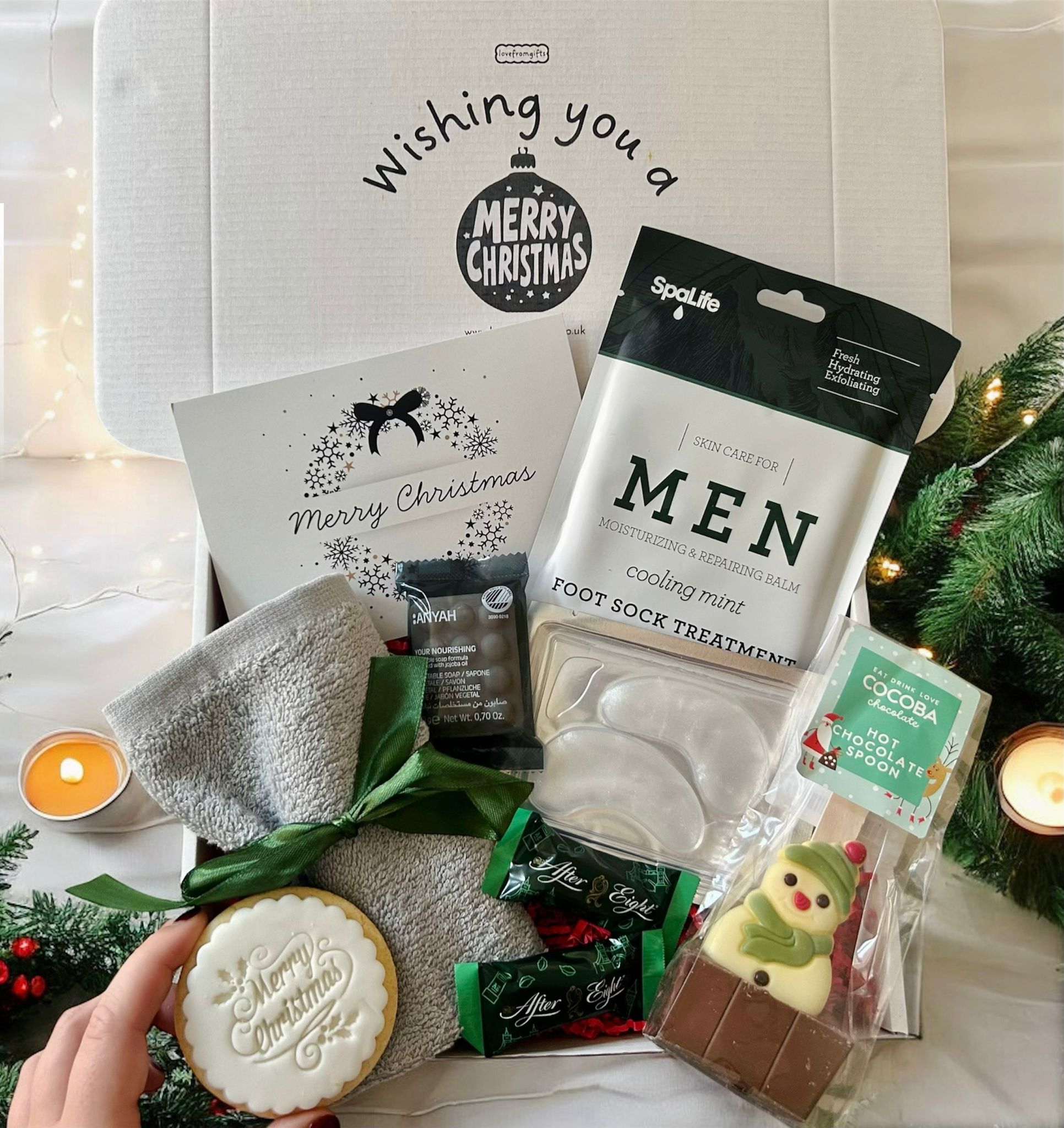 Winter Warmer Cosy Box filled with seasonal comforts such as hot chocolate, fluffy socks, a scented candle, and festive treats, beautifully packed to bring warmth and relaxation